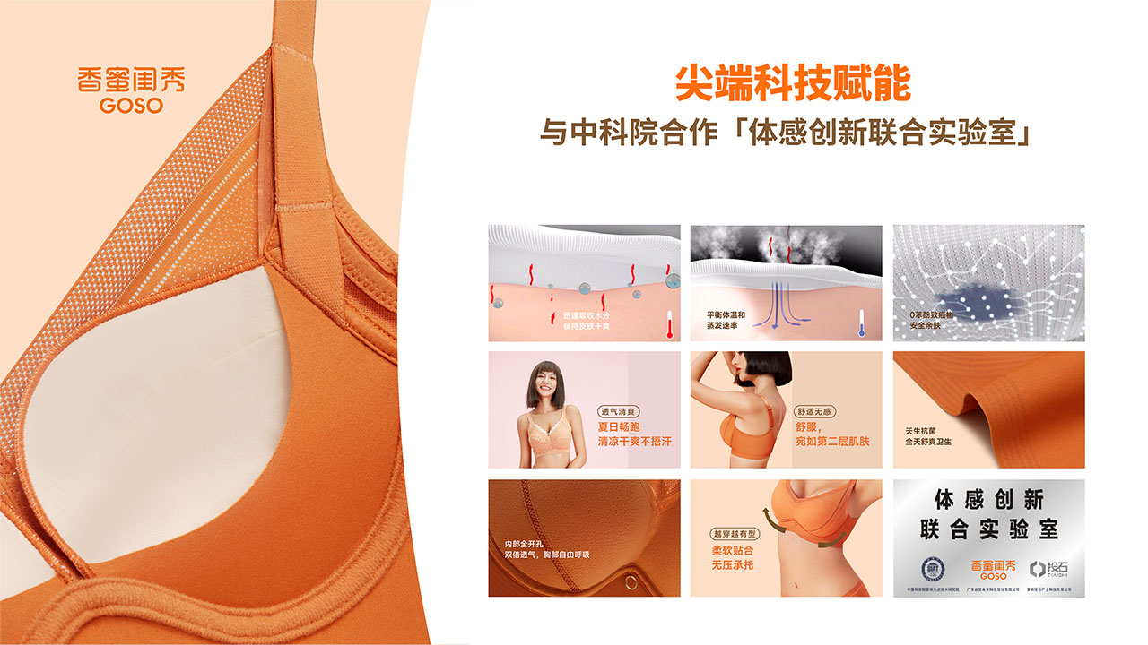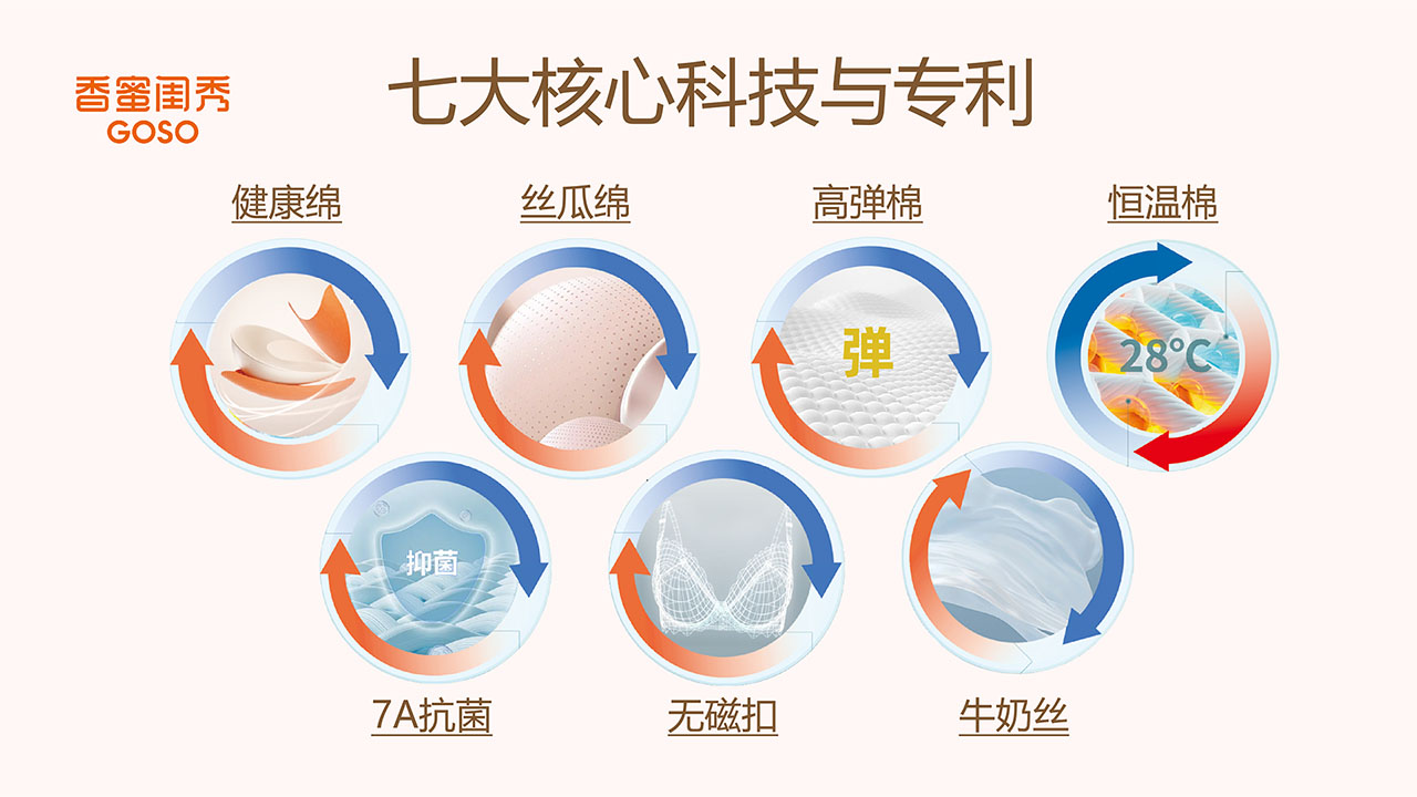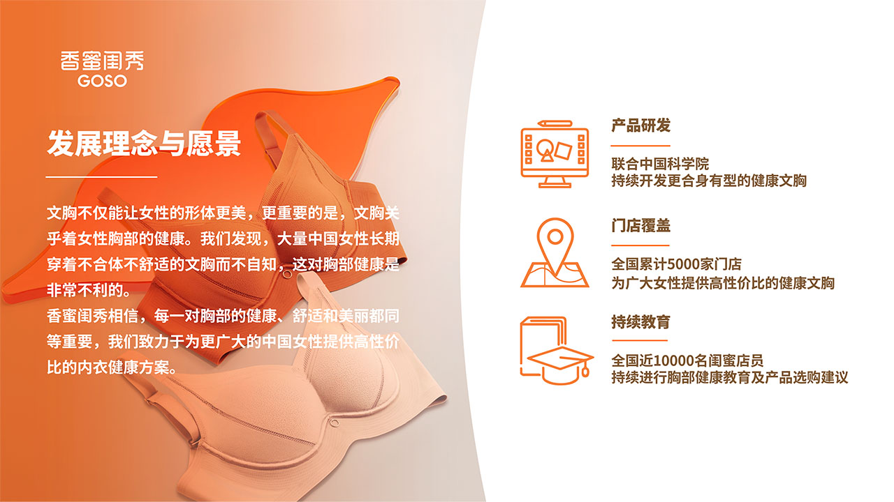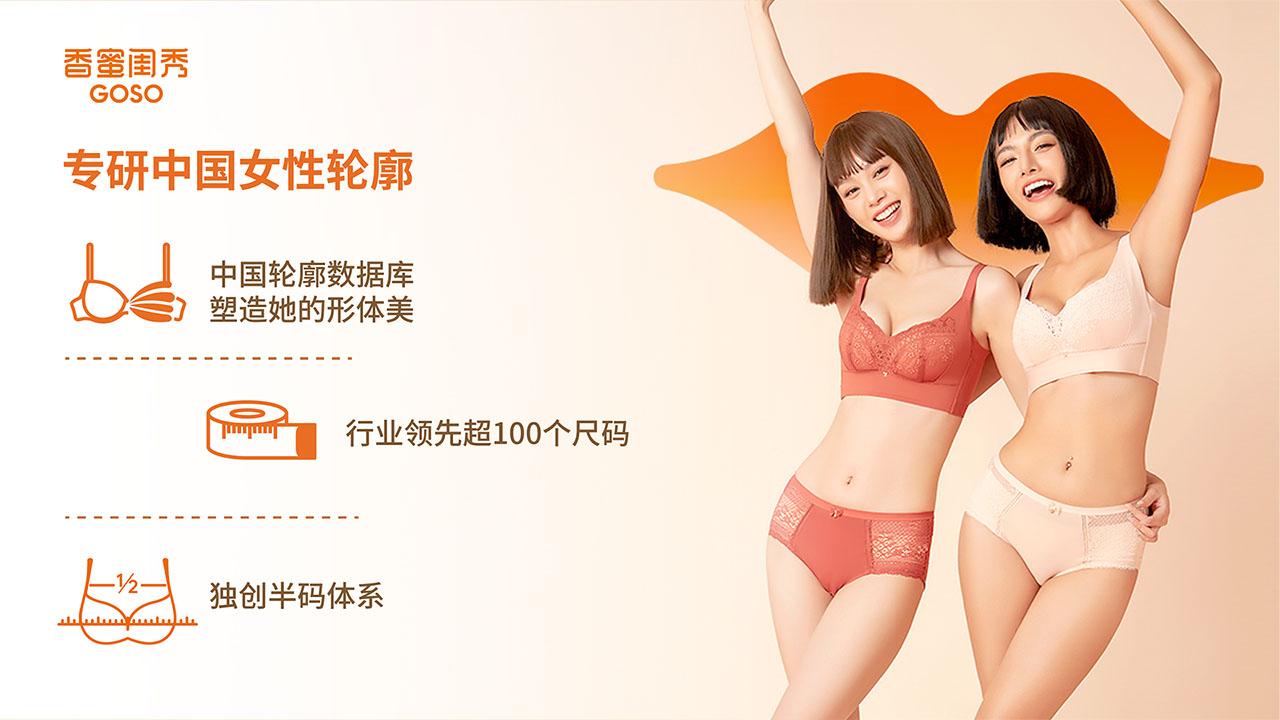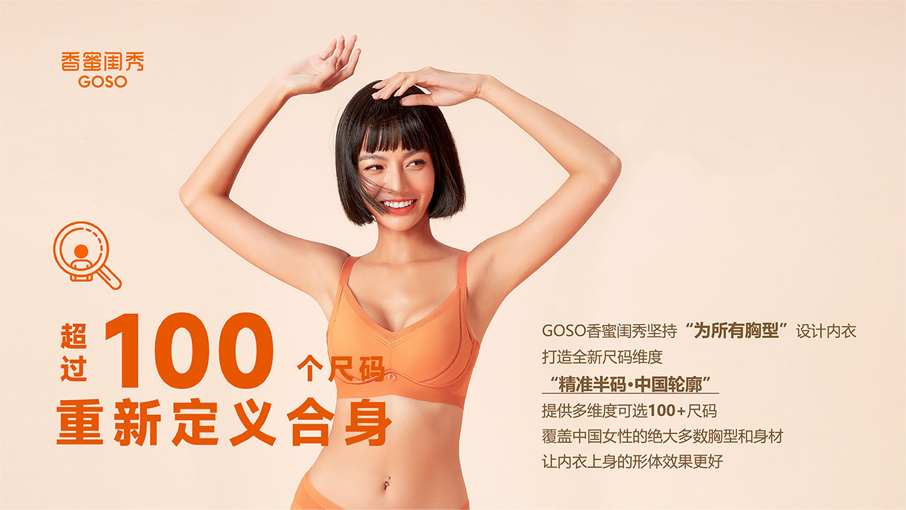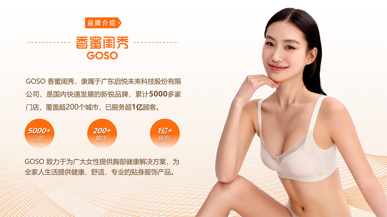 GOSO 香蜜闺秀,隶属于广东启悦未来科技股份有限公司,是国内快速发展的新锐品牌,累计5000多家门店,覆盖超200个城市,已服务超1亿顾客。GOSO 致力于为广大女性提供胸部健康解决方案,为全家人生活提供健康、舒适、专业的贴身服饰产品。
